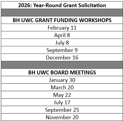 - BH UWC Grant Funding Workshops: Feb 11, Apr 8, Jul 8, Sep 9, Dec 16